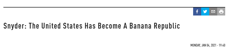 对于不断贬值的美元,以及无力应对新冠病毒背景下,每况愈下的美国经济,美国金融网站Zerohedge1月4日援引专家表示,美国已成为香蕉共和国 (是一个经济体系属于单一经济,通常是经济作物如香蕉等,并且经济社会环境不稳定,债务高企经济体的贬称) 。报道称,如果我们继续以目前的速度摧毁美元,卫生纸最终将比美元更有价值。