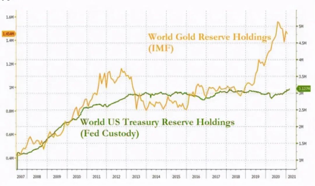 还需要注意的另一个现象是,全球央行关于美债这一美元核心资产与黄金储备的布局已发生反转式变化。如下图: