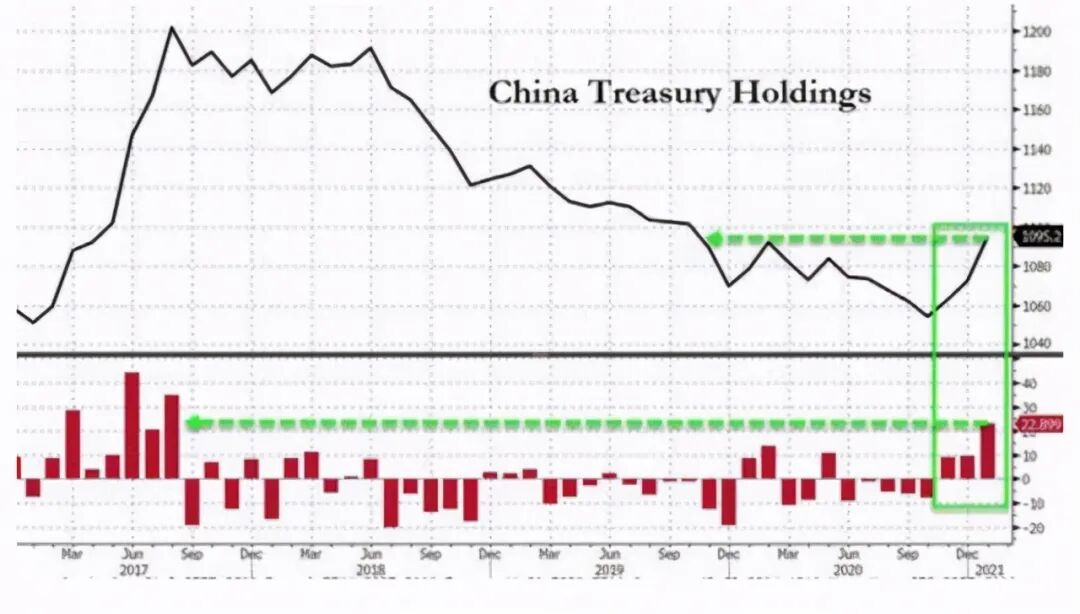 值得一提的是,事情的一个新变化是,根据美财政部3月15日公布的国际资本流动报告TIC(美债数据延后两个月公布惯例),1月中国持有的美国国债规模在1月增加229亿美元,达到1.095万亿美元,创下2019年10月以来最高水平。1月份的229亿美元是自2017年8月以来最大的月度购买量。不过,需要注意的是,在截至2020年12月的27个月间,已累计共减持约1758亿美元的美债。