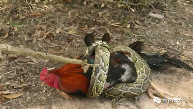 虽说公鸡拼死挣扎,无奈蛇缠得太紧,导致公鸡的反抗没有丝毫效果。