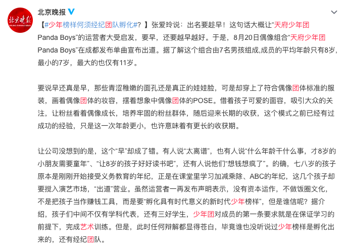 北京晚报发博批评:少年榜样何须经济团队孵化?