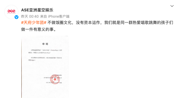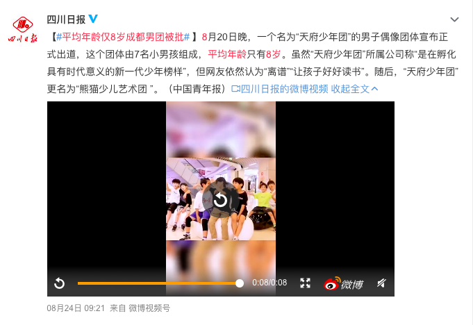 被批后,公司便回应说,没有资本,不搞饭圈,只为追梦,是要孵化青少年榜样,并将“天府少年团”改名为“熊猫少儿艺术团”。