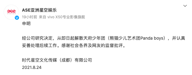 迫于各种舆论压力,8月24日,经纪公司宣布解散这个团: