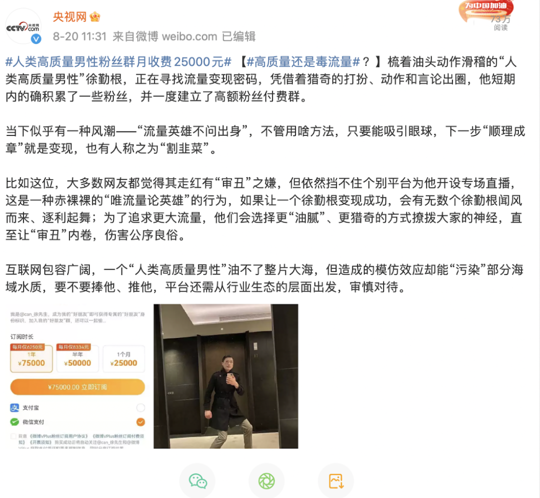 有网友曝光,徐勤根的粉丝群月付费两万五才能进入: