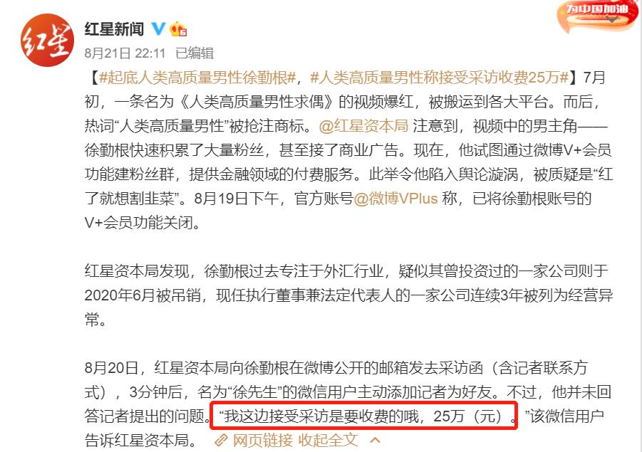 还有媒体爆料,徐勤根接受一次采访需要收取25万的费用: