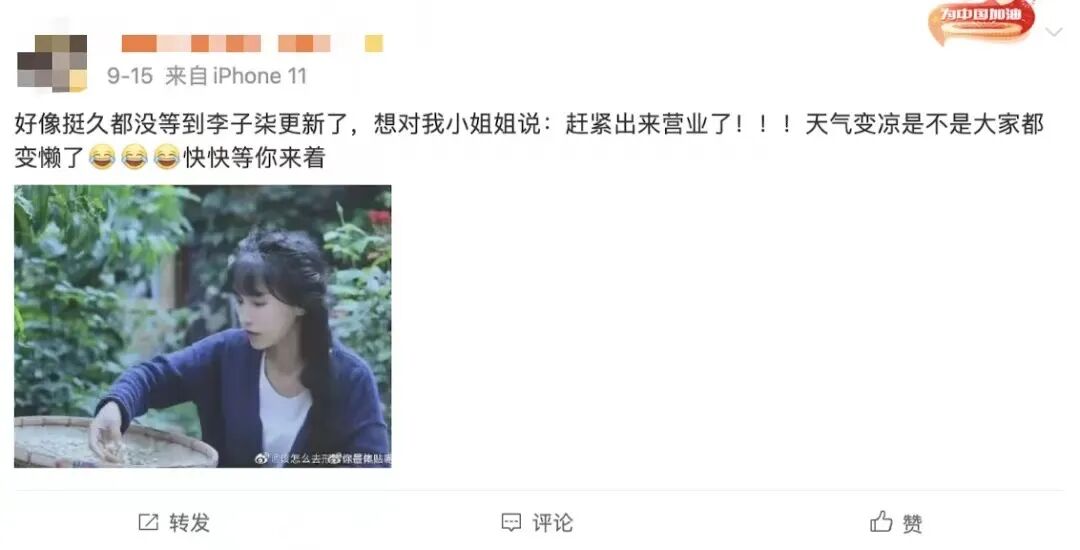 很多网友都在微博上喊话,希望李子柒能快点“营业”: