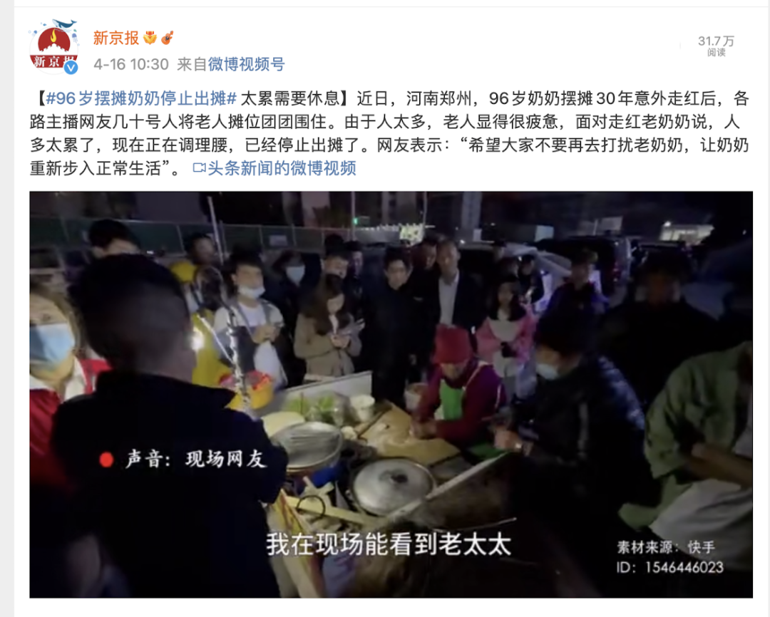 讽刺的是,老奶奶的视频走红后,奶奶的摊子就被一群网红盯上了。