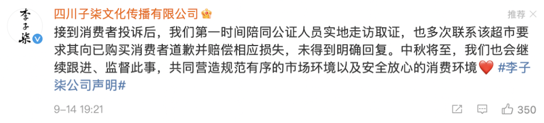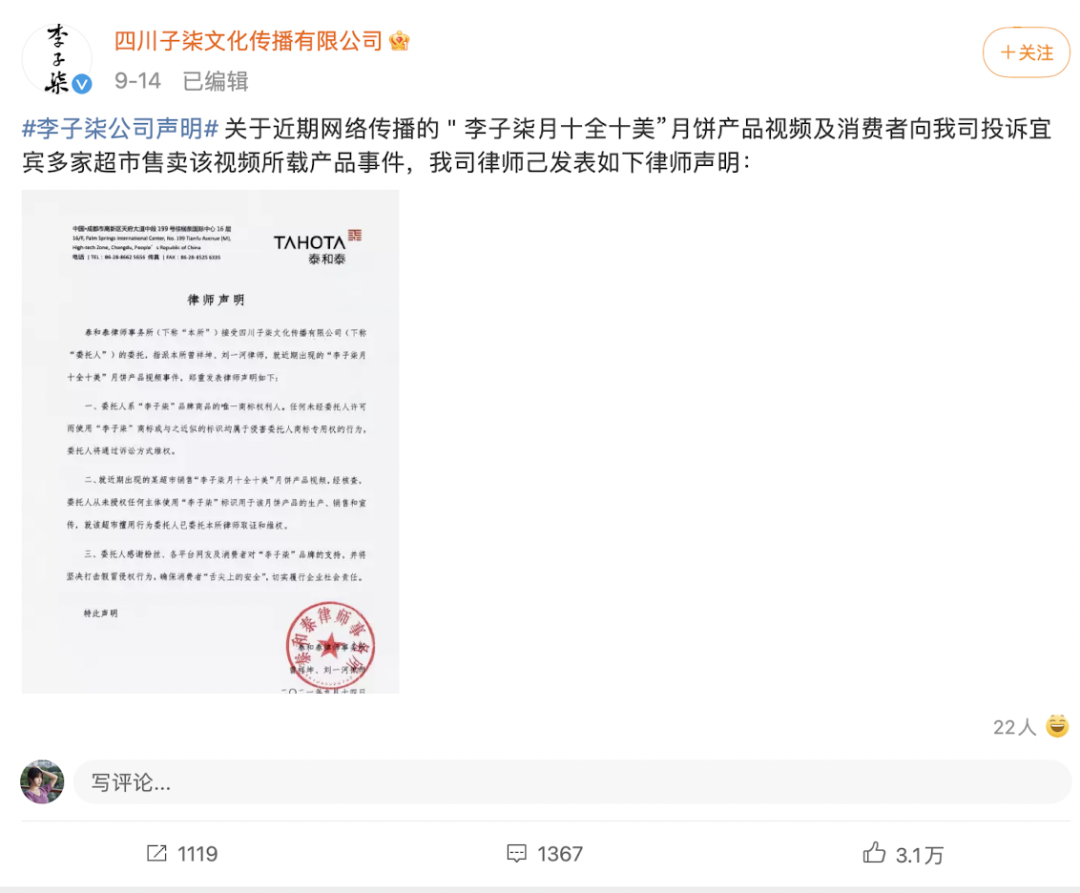 9月14日,李子柒的公司发布了律师声明,称被人冒用品牌。