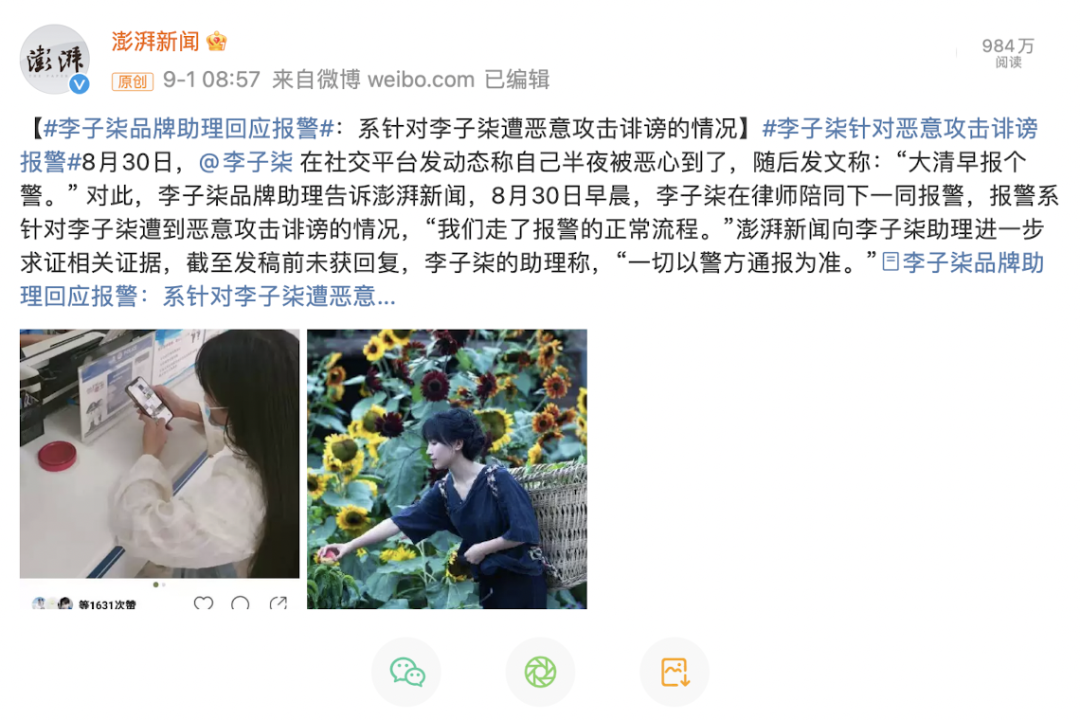 后来她的品牌助理回应,报警是因为李子柒遭受了恶意攻击诽谤。
