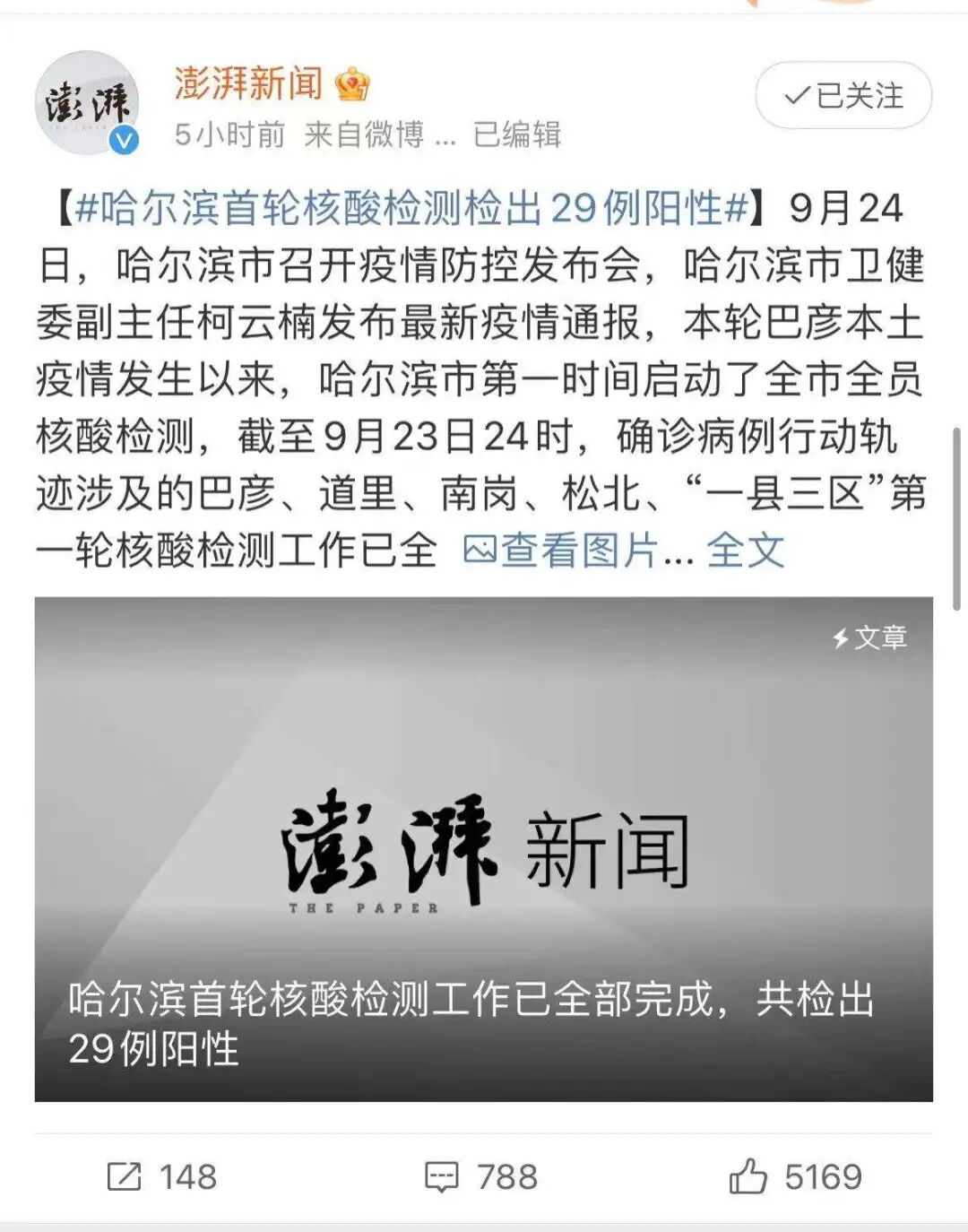 截止到目前为止,哈尔滨首轮核酸检测检出29例阳性。