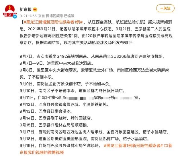 9月21日,哈尔滨新增新冠病毒阳性确诊病例3例。