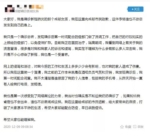 而后,确诊的成都女孩发长文,向成都全市人民道歉: