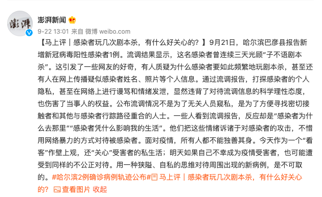 澎湃新闻马上评称,“一些人看到流调报告,反应却是“感染者为什么去那里”“感染者凭什么影响我的生活”。