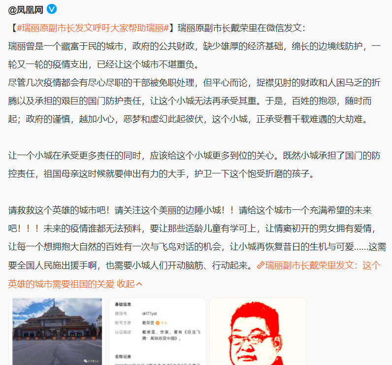 戴荣里写这篇文章的本意,也并非想引起大家的抱怨,也并非要抨击什么东西,更多的是希望全国人民关心瑞丽人民,哪怕只是精神上的支持和关注。