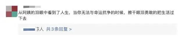 有位网友说:“从阿姨的泪眼中看到了人生,当你无法与命运抗争的时候,擦干眼泪勇敢的把生活过下去。”