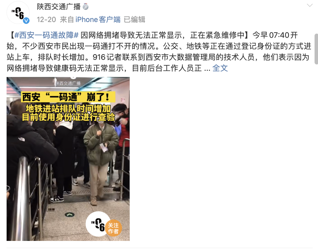 在12月20号上班早高峰,西安还曾经出现了“健康码故障”的情况。