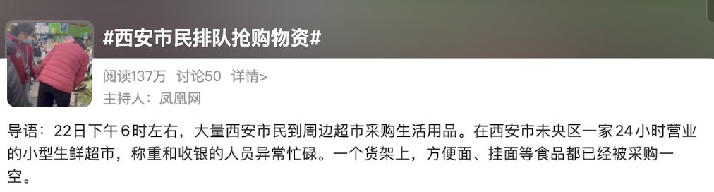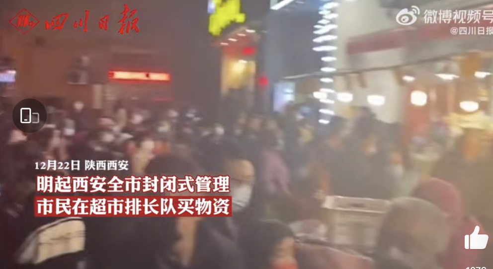 昨天,西安封城的消息一出,西安多家超市出现了市民排队抢购生活用品的现象: