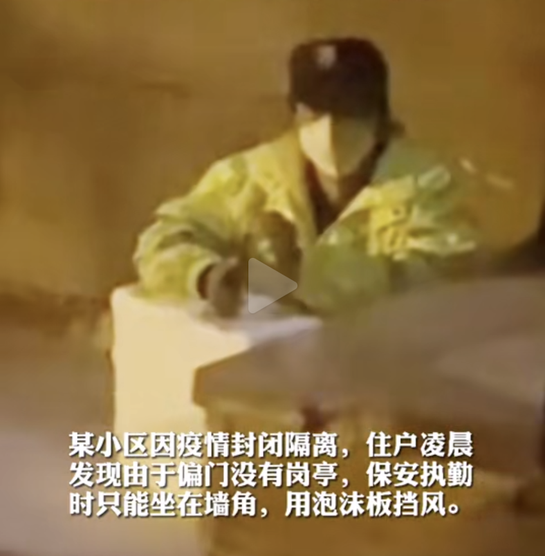 昨天凌晨,某小区防疫执勤保安在如此寒冷的夜晚,一晚上坐在墙角,只能用泡沫板挡风:
