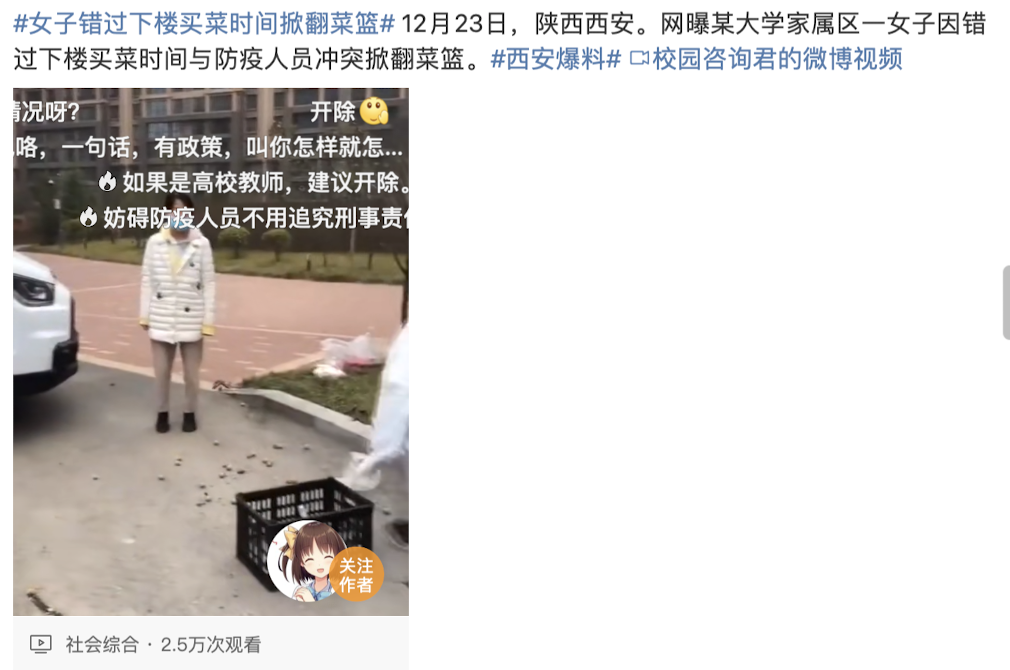 今天,网传还有一名女子因错过下楼买菜时间,与防疫人员发生了冲突,掀翻菜篮。