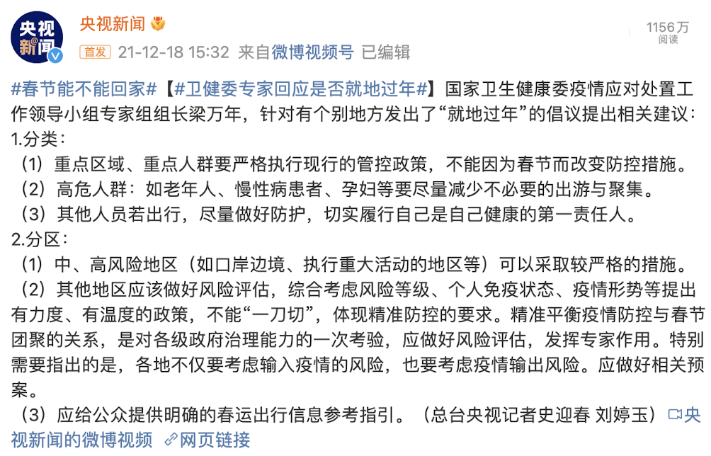 国家卫健委对此回应,是否就地过年不能一刀切,要分类分区。