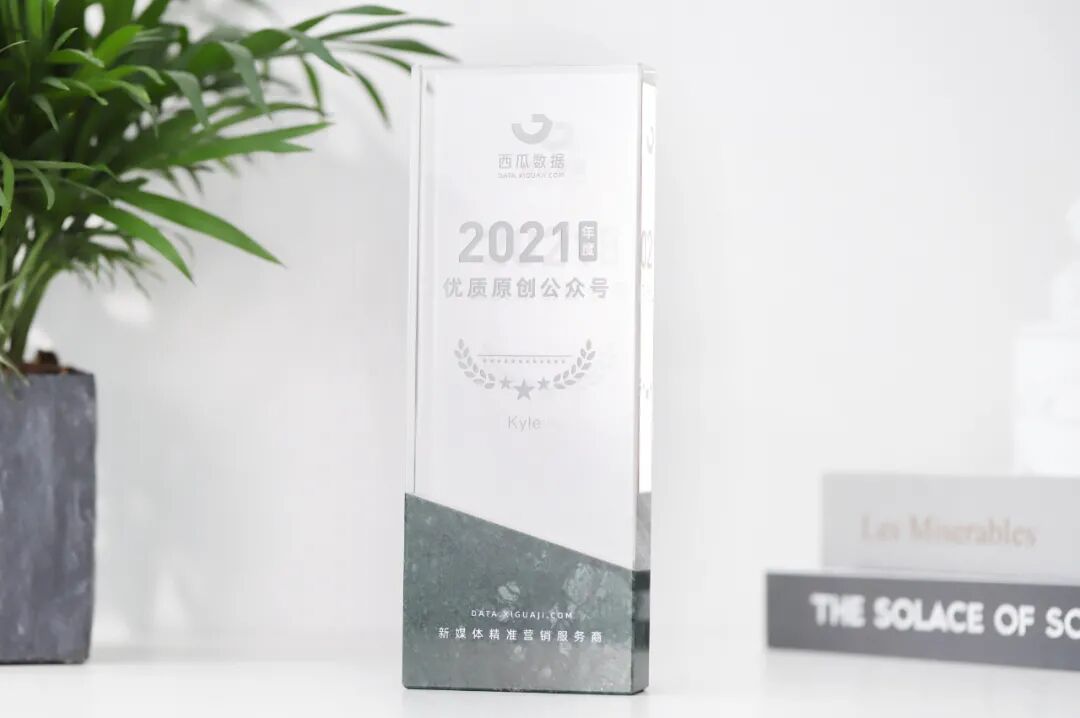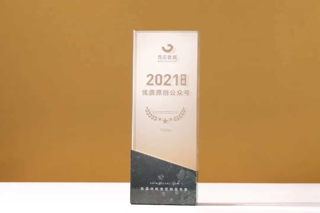Kyle荣获由西瓜数据颁发的“2021年度优质原创公众号”奖杯。