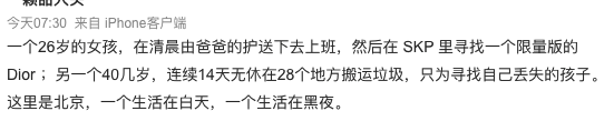 这两人的生活可以说是明显的贫富差距了:一个在skp找奢侈品,一个辗转多地找丢失的孩子。