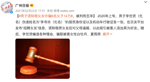 比如这位“李寻欢”,假装要租女友,实际却是骗钱,前后骗了6人共14万元。