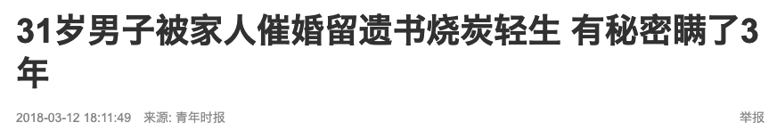 2018年,杭州一位31岁男子被家人催婚,最终崩溃,留下遗书后,在房间内烧炭自杀。