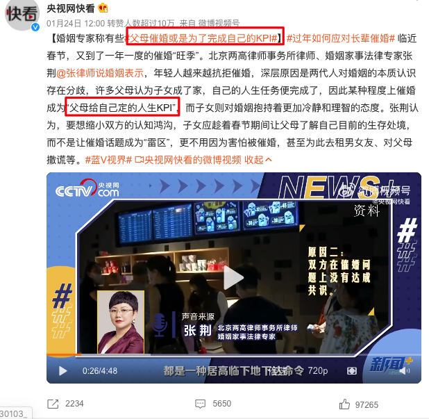 这就像央视点出的这个现象:“父母催婚可能只是为了完成自己的kpi”。