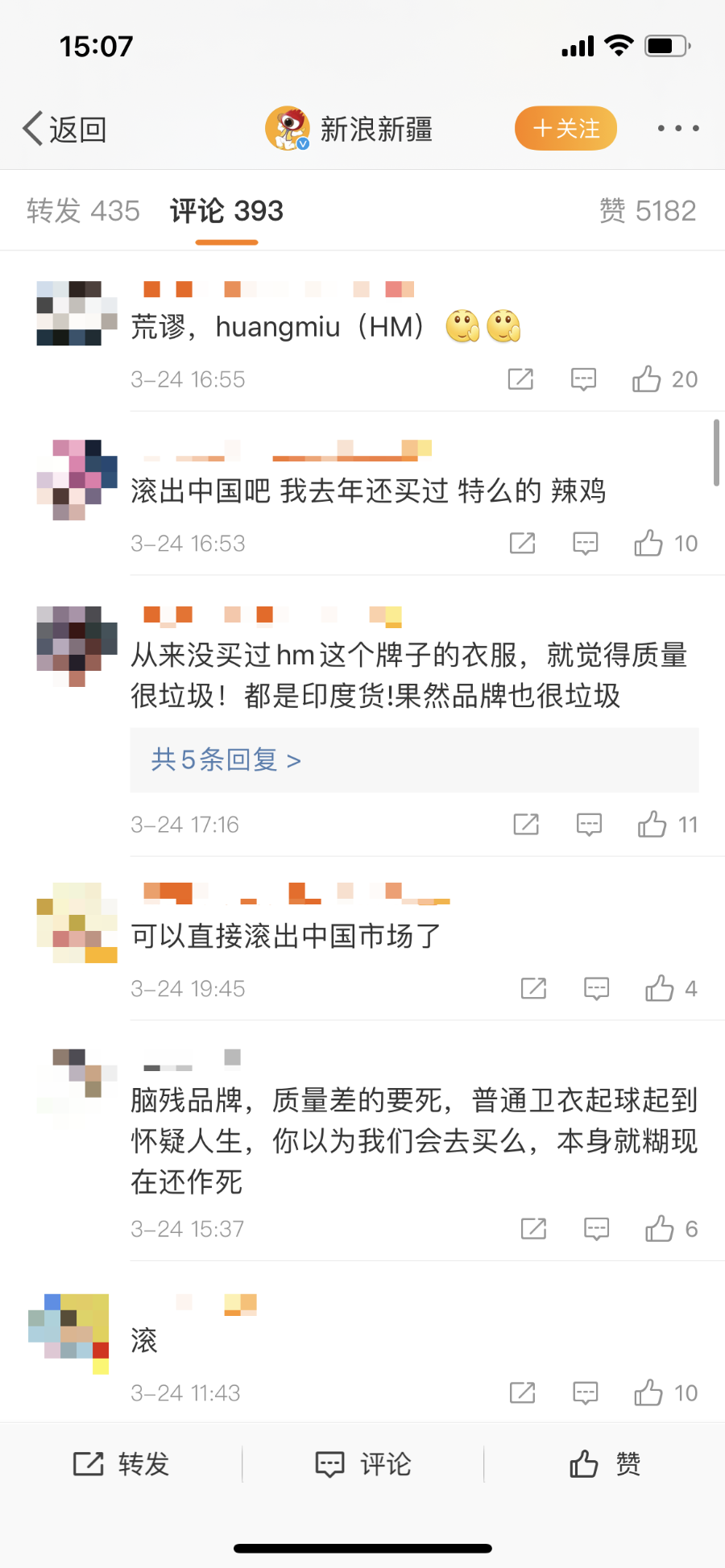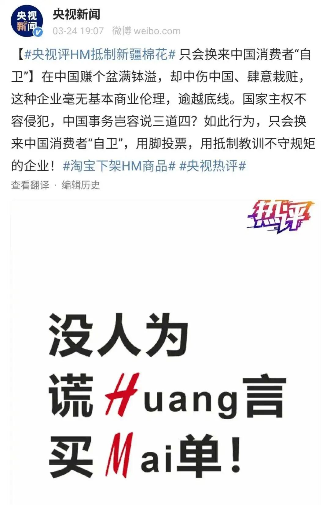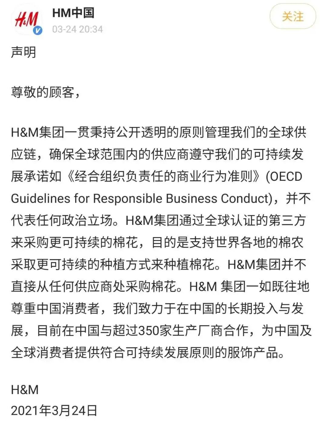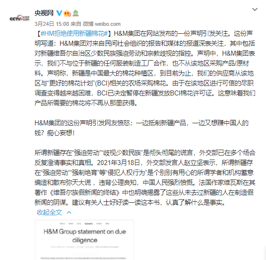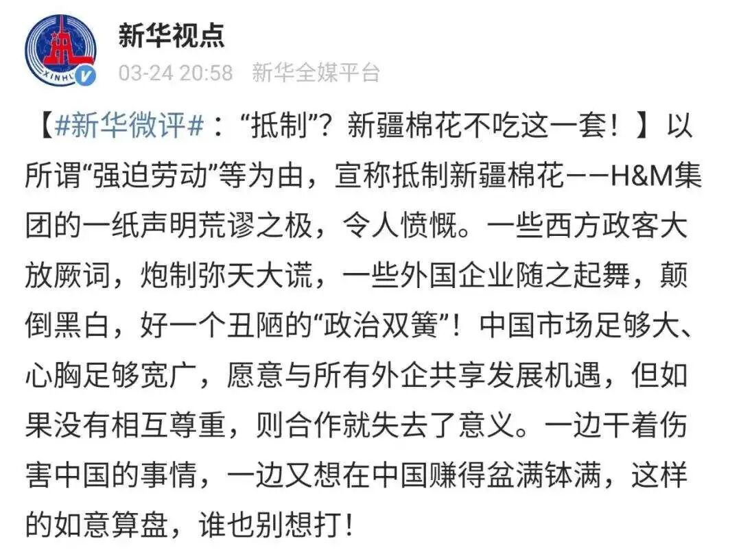 知名快时尚品牌H&M公开碰瓷新疆棉花。