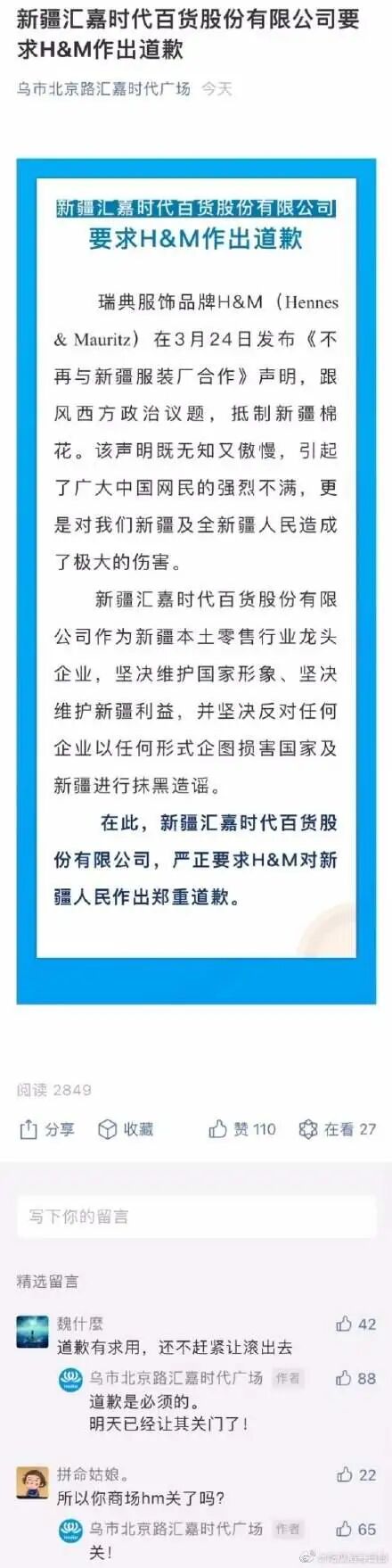 并且,乌鲁木齐某商城发文要求HM道歉,并且要求其商场内HM线下店关门: