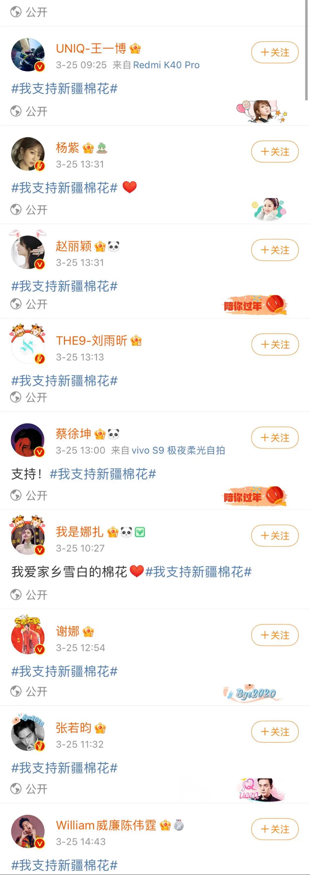 #我支持新疆棉花#的话题冲上了微博热搜,各路艺人和网友纷纷声援新疆棉花: