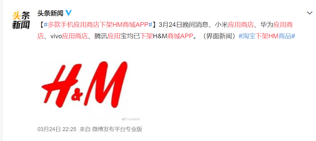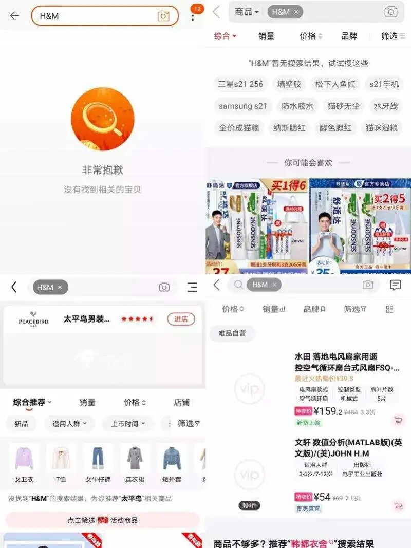 同时,各大电商平台下架了H&M的产品,目前在淘宝、京东、拼多多、唯品会等都已经无法搜索到H&M的产品、店铺。