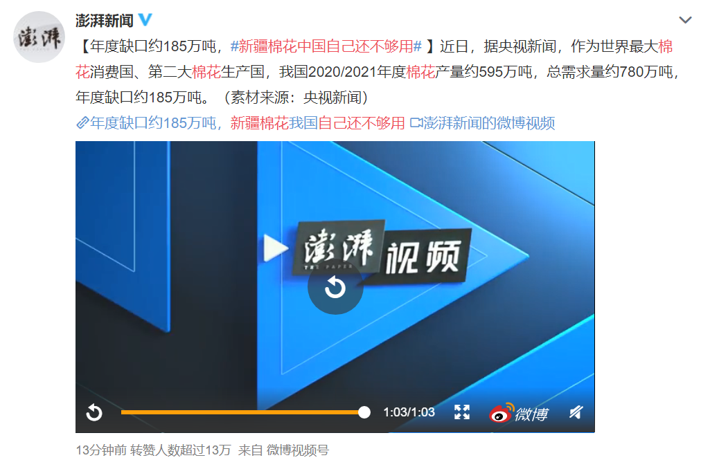 据央视新闻,作为世界最大棉花消费国、第二大棉花生产国,我国2020/2021年度棉花产量约595万吨,总需求量约780万吨,年度缺口约185万吨。