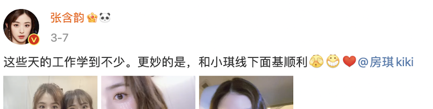 而张含韵早在3月份,官宣参加《为歌而赞》以前,就在微博晒出了和房琪的合照。