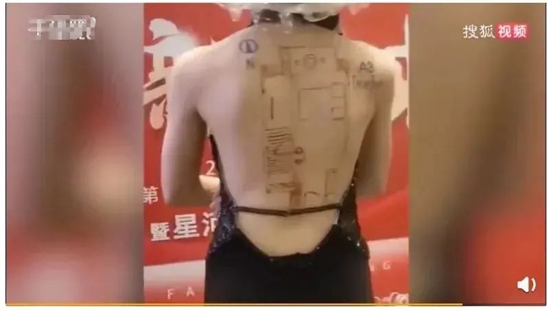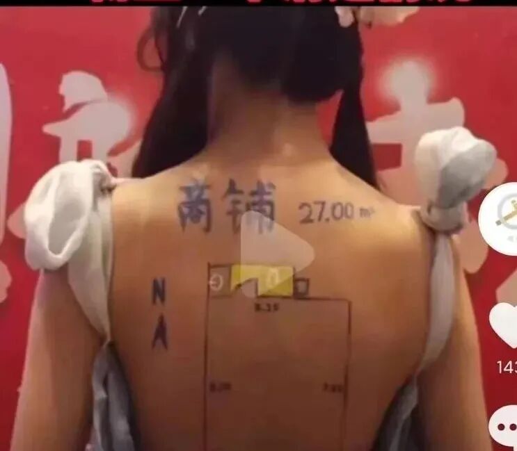 只见两位女模特都穿着清凉,裸露的后背上正是两种户型图。