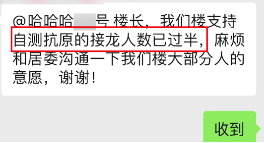有一次,因为下楼验核酸有交叉感染的风险,楼里很多人提议要在家做抗原代替核酸,投票接龙支持的人数过半了。