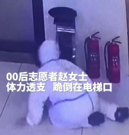 有一位00后志愿者,因为穿了太久防护服,体力透支倒在电梯前。