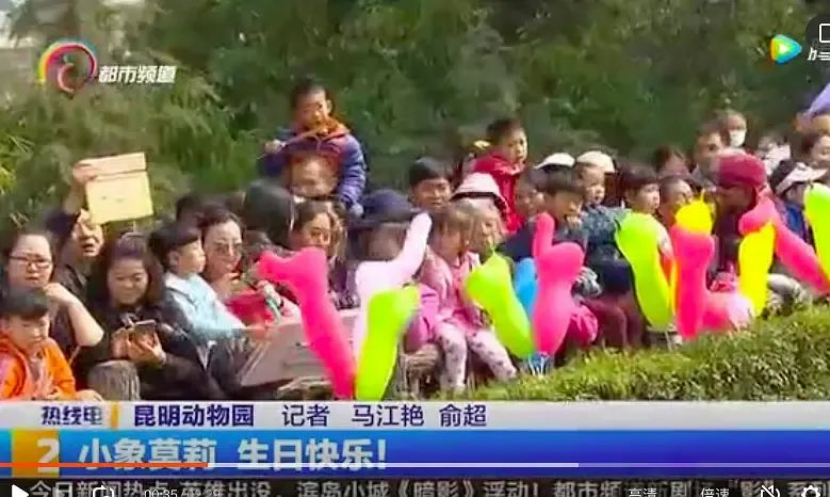 一周岁生日那天,刚好是“国际幸福日”,昆明动物园为“象公主”办了个盛大的生日会,现场500多个小朋友在家长的陪同下,一起挥舞着彩旗,为她庆祝生日。
