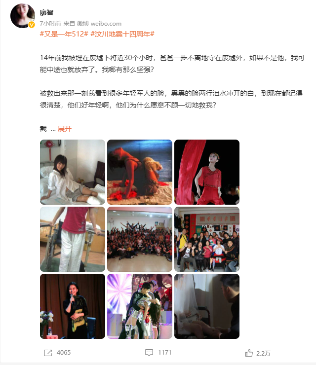 如果没有14年前那场天灾,廖智可能还在四川绵阳做舞蹈老师,和朋友合作的舞蹈学校已经办起来了,家也可能还没散,日子还可以过下去。