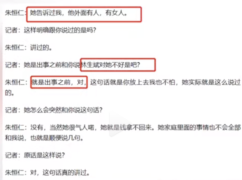 朱小贞父母更在接受采访时证实了此事:“女儿生前亲口告诉我,林生斌外面有人。”