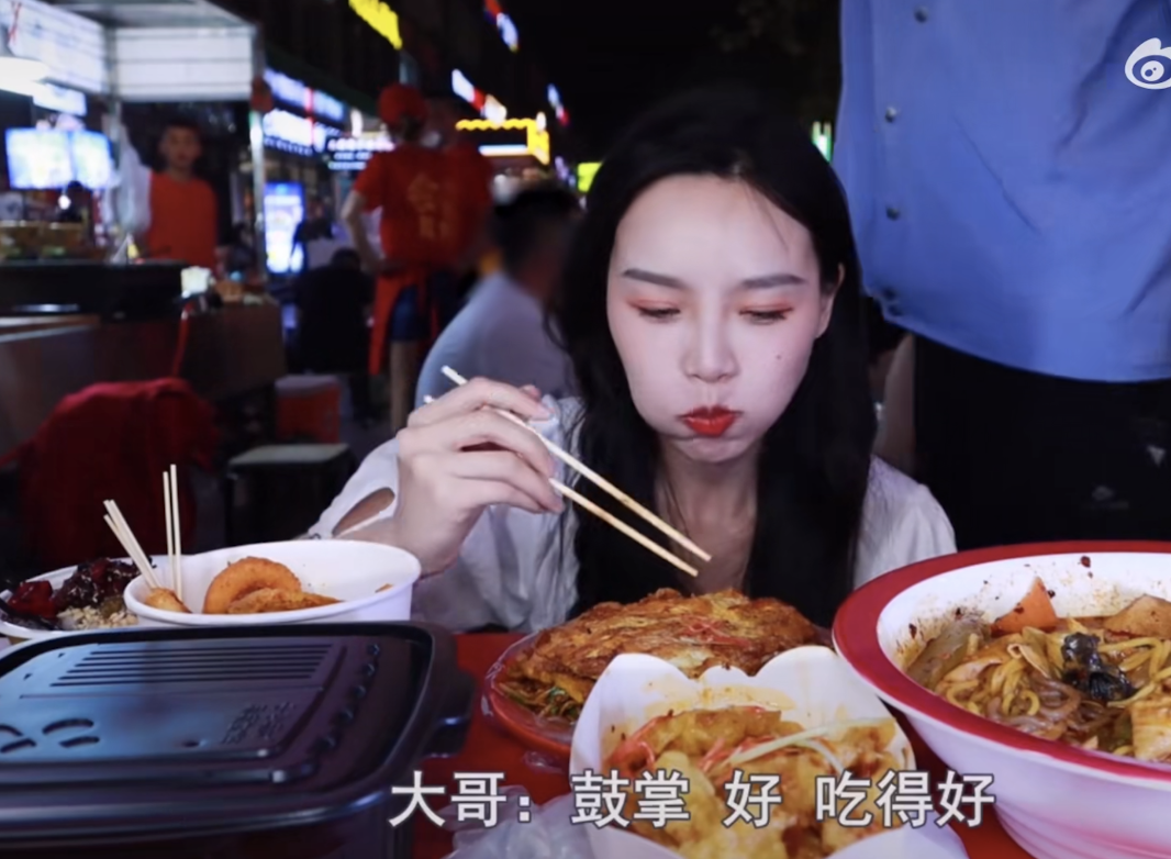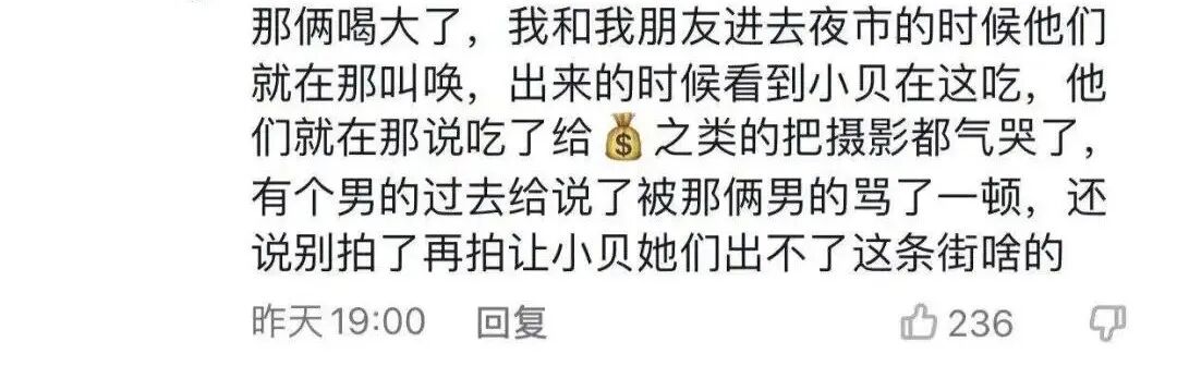 事发当晚,小贝在夜市录制美食视频,有不少路人在安静围观,可唯独有两名男子一直起哄,让她快点吃。