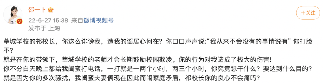 邵一卜曾让她停止这种造谣行为,可对方却说:“凭什么,嘴巴长在我身上,我想怎么说就怎么说!”