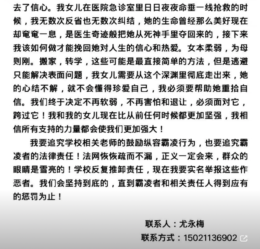 然而,当她询问女儿情况时,邵一卜终于忍不住崩溃大哭,把所有实情都告诉了妈妈:她根本没说过这样的话,都是同学们诽谤造谣,他们还羞辱她“父母都死了,怎么她不一起去死”。