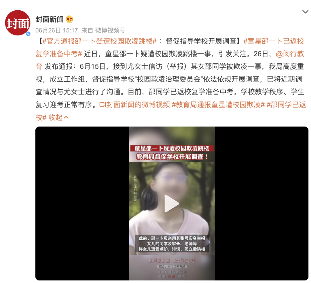 26日,教育局回应了邵一卜校园霸凌一案,已经成立了工作组,对此案依法展开调查。邵一卜也已经返学复学。