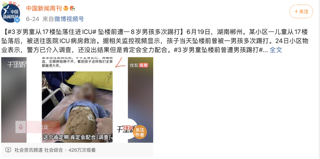 不只是邵一卜一案,最近校园霸凌案频发,未成年人犯罪的新闻也越来越多,比如前几天湖南的“3岁男童坠楼案”,男童在坠楼前曾被一位8岁男孩单独带走,监控显示,他曾被对方多次踢打。