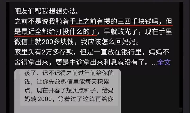 这位网友家里存款就2万多块,却把三四千块拿去打投,妈妈想拿2000块买点种子,网友手里却只剩200块钱,不知道怎么和家人交代……