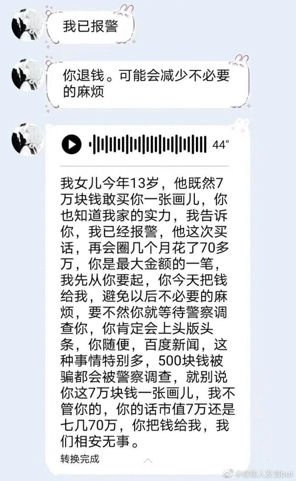 一名13岁女孩花70万元,瞒着家里找画师约稿,最贵的一幅高达7万元,家长发现后要求画师退款。