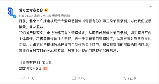 5月4日,北京市广播电视局责令涉事的爱奇艺暂停《青春有你》第三季后续节目录制,这档节目原定8日进行的总决赛也就此成空。