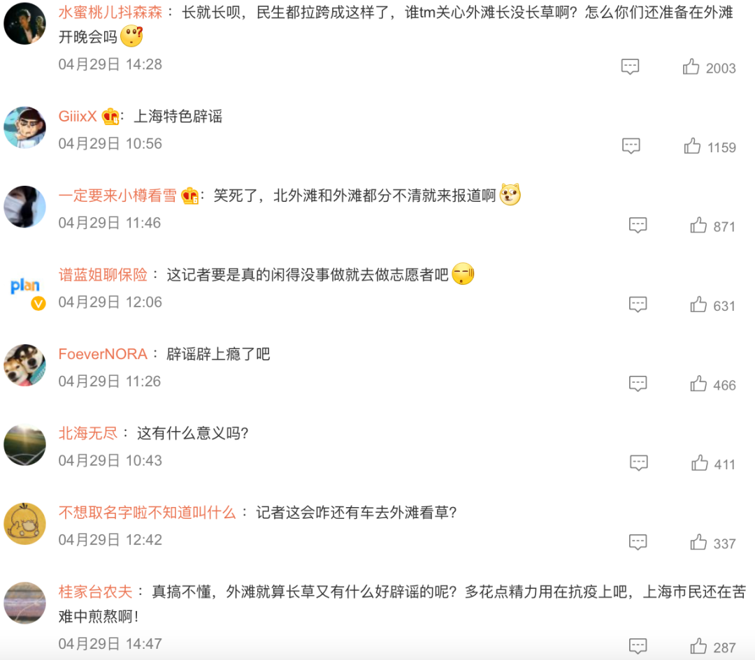 再换个角度,外滩没长草,谣言就是个谣言,它会造成什么后果呢?影响社会和谐了,还是煽动不安情绪了?